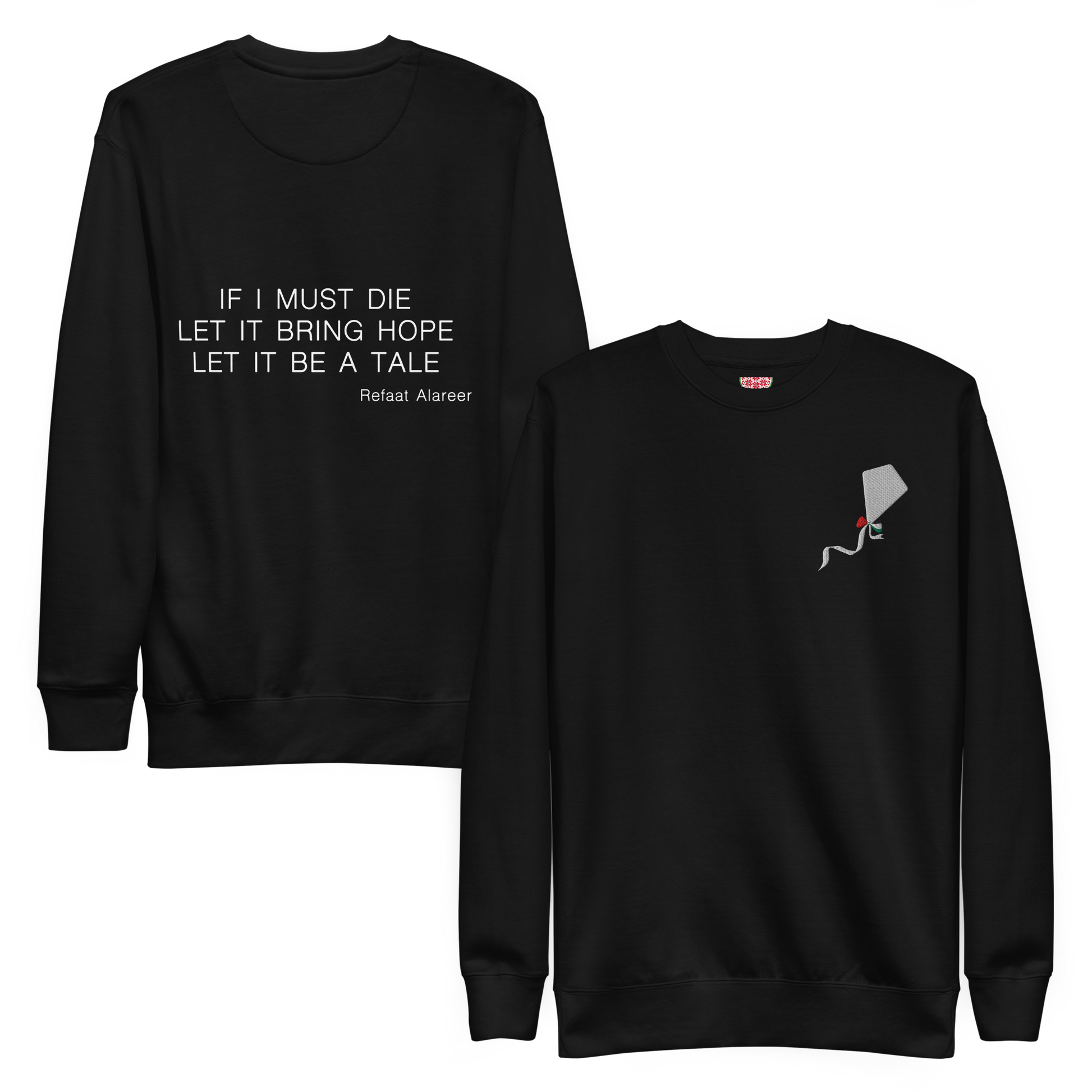This sweatshirt features a machine-embroidered kite at the front and the words of Alareer printed at the back. Wear it to honour the stories of Palestine and Palestinians that must be told.